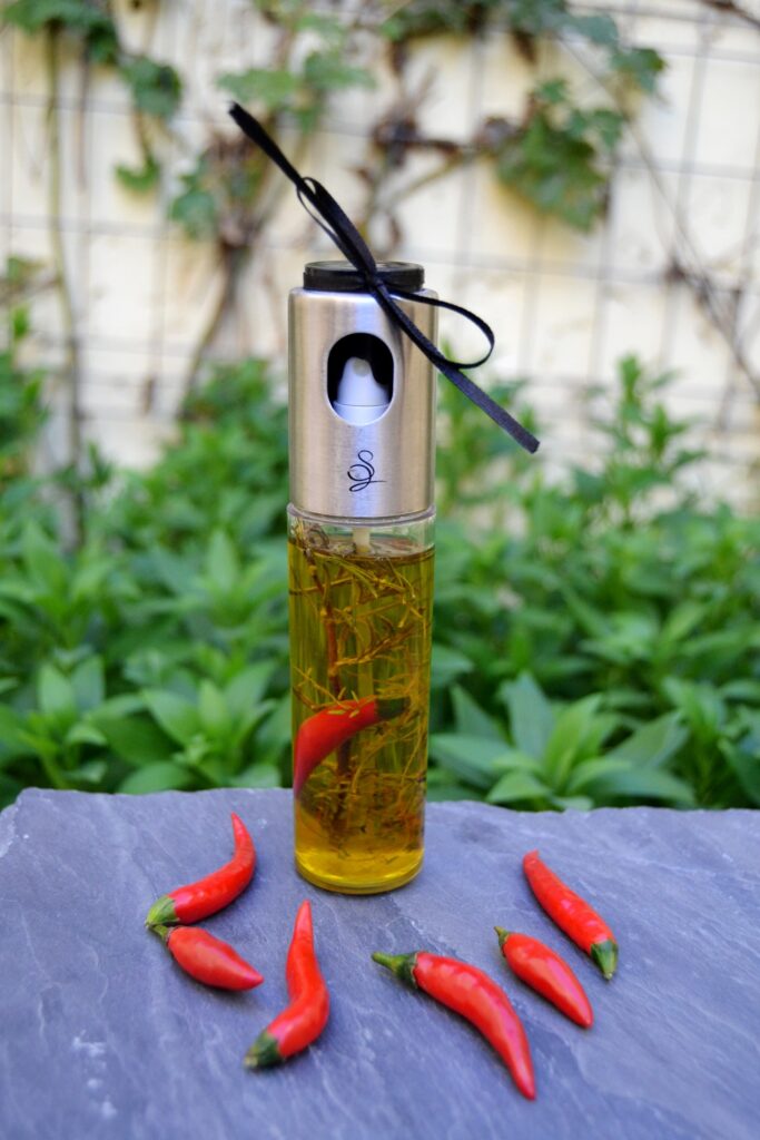 E uma dessa prendinhas que costumo ver são os azeites aromatizados, que podemos facilmente fazer em casa, utilizando inúmeros ingredientes, o que torna esta prenda bastante versátil também, Hoje optei por fazê-lo a partir de tomilho e alecrim frescos, que tenho nos meus vasos cá em casa, e umas malaguetas vermelhas lindíssimas. A preparação não podia ser mais simples… e finalizei apenas com um laço meio tosco. Mas este não é um azeite aromatizado qualquer! O frasco tem pulverizador, e essa é a novidade da minha sugestão de hoje, porque permite reduzir a quantidade de gordura que ingerimos, e que será certamente muito útil para grelhar carnes, peixe ou legumes, cortando também nas calorias, ao usar apenas a quantidade de gordura estritamente necessária.