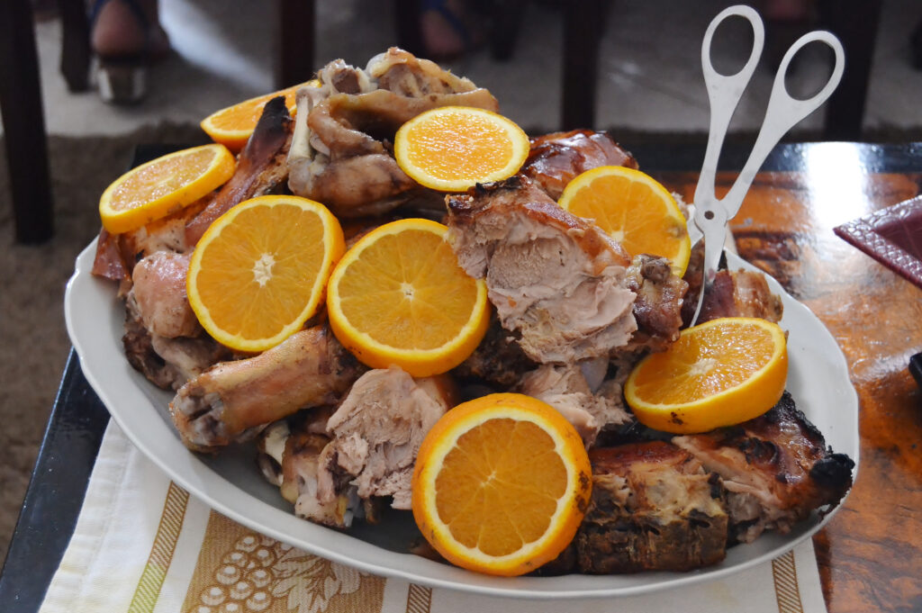 7. Corte-o em pedaços, pincele novamente com o molho e sirva de imediato com rodelas de laranja, batatas fritas e salada.