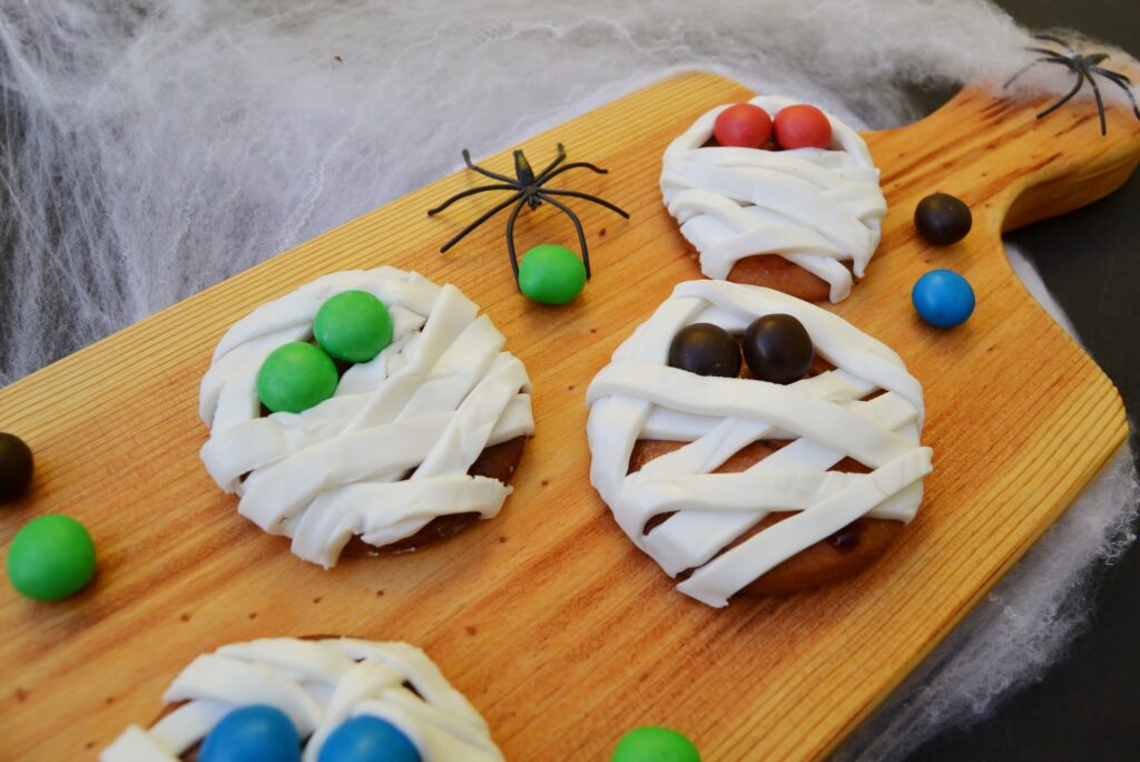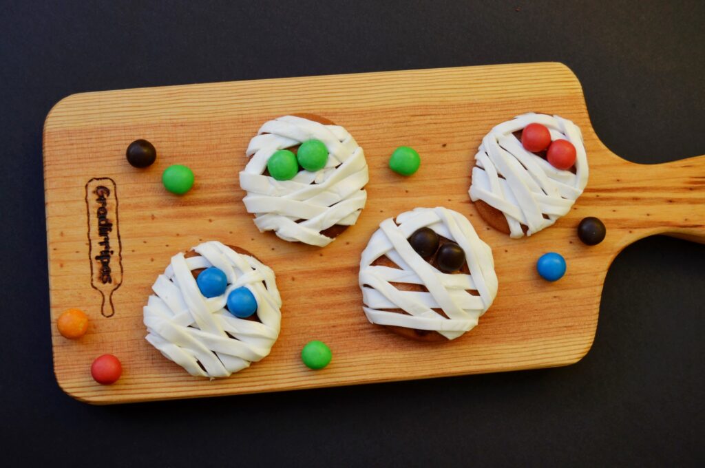 8. Pincele as bolachas com um pouco de geleia e fixe dois M&M’s para os olhos, dispondo as tiras de pasta de açúcar sobre as bolachas, imitando as ligaduras das múmias.