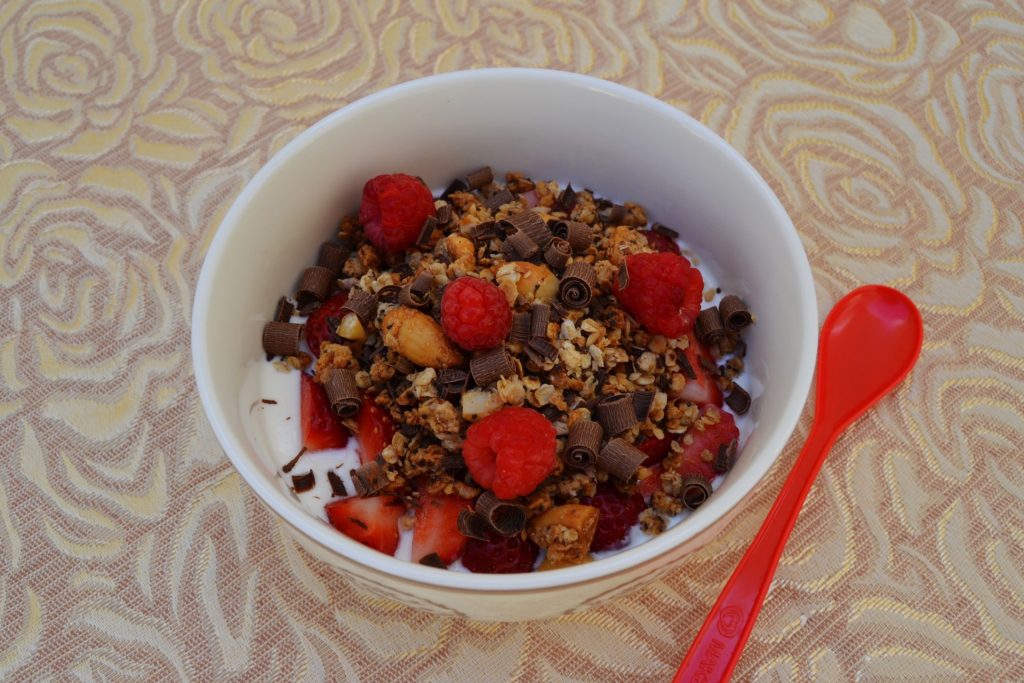 3. Adicione os morangos e as framboesas, e polvilhe com granola de chocolate a gosto.