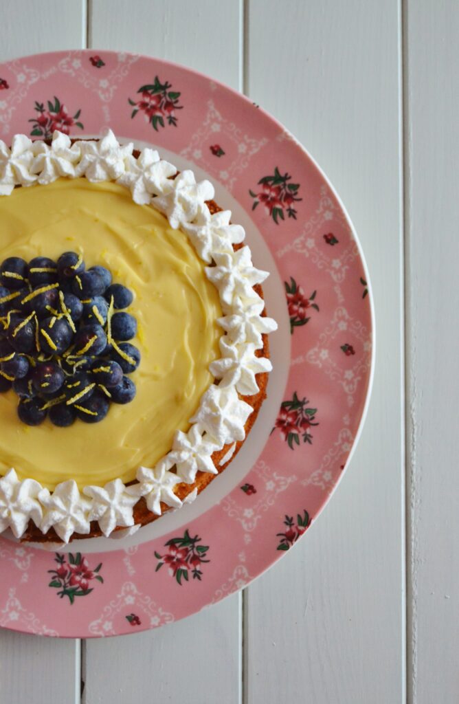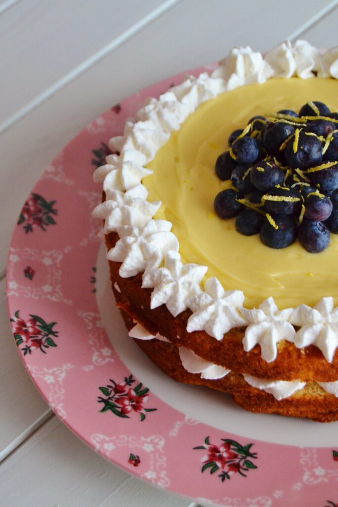 10. Disponha o restante chantilly sobre o bolo, bem como o lemon curd caseiro, decorando com os mirtilos e raspa de limão a gosto.