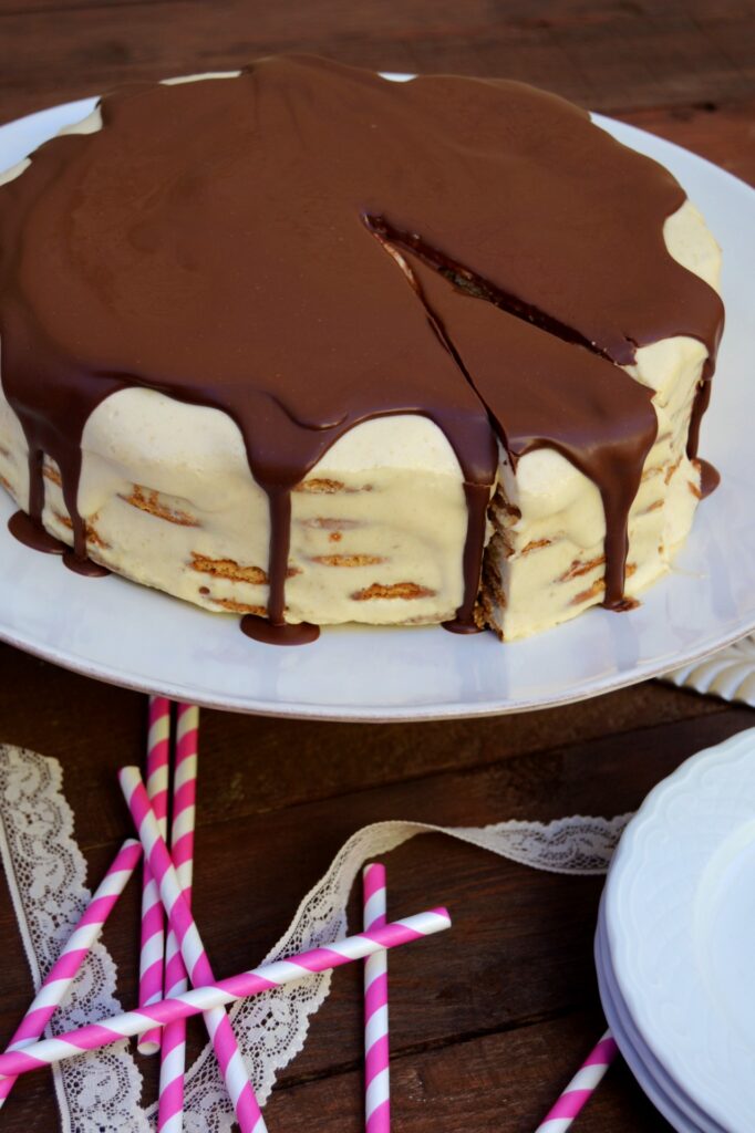 9. Na hora de servir, desenforme o bolo de bolacha e cobra-o com o creme de chocolate.