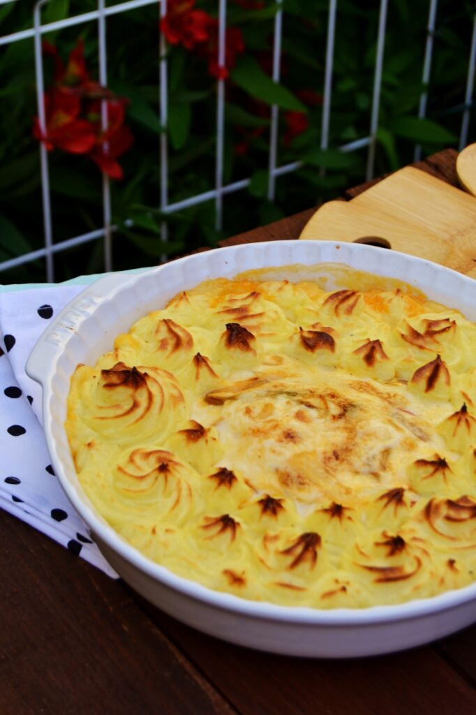 8. Coloque o puré num saco de pasteleiro e distribua nas laterais da pescada.