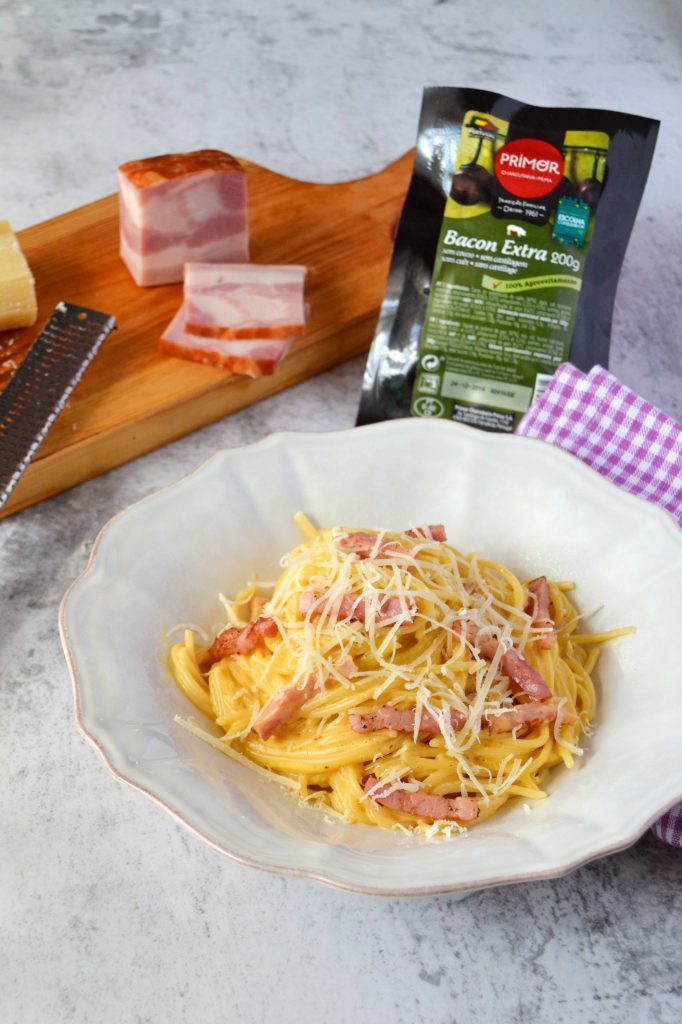 Na escolha dos ingredientes convém terem dois cuidados. O bacon deve ser de ótima qualidade porque o resultado final vai depender disso claro, quão melhor o vosso bacon, mais saboroso e rico o vosso carbonara! Eu escolho sempre o bacon da Primor, quem me conhece já sabe. E também devem usar queijo parmesão fresco, ralado na hora… porque o sabor nem tem comparação!