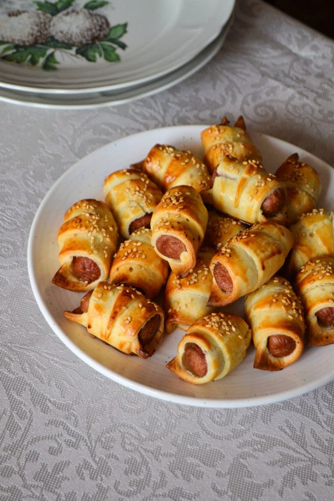 2. Corte as salsichas em metade, e coloque cada metade sobre a parte a mais larga do triângulo de massa folhada. Polvilhe com eras aromáticas a gosto.
