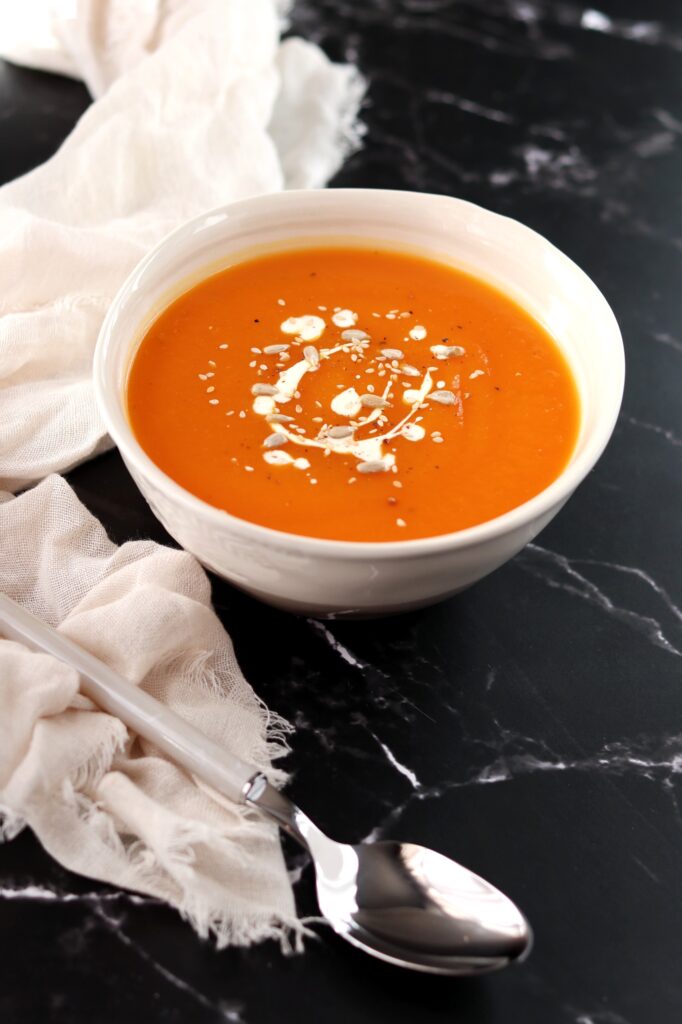 4. Sirva o creme de abóbora com um fio de nata e sementes a gosto.