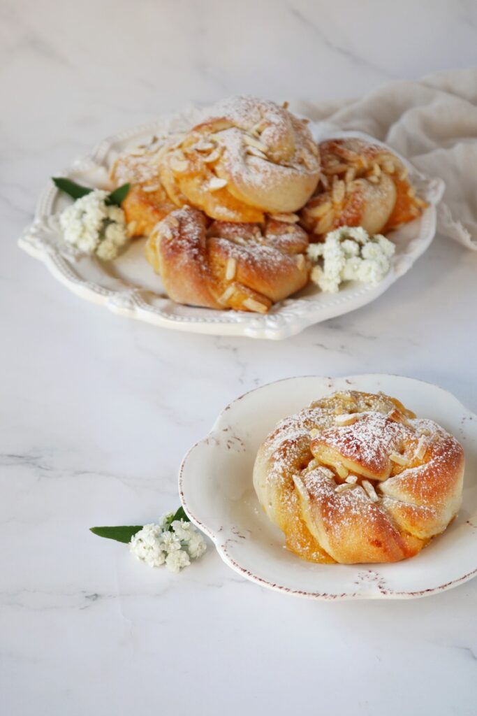 - Coloque os rolinhos num tabuleiro, previamente forrado com papel vegetal e polvilhe com a amêndoa palitada. Tape o tabuleiro com um pano limpo, e deixe levedar durante 1 hora.